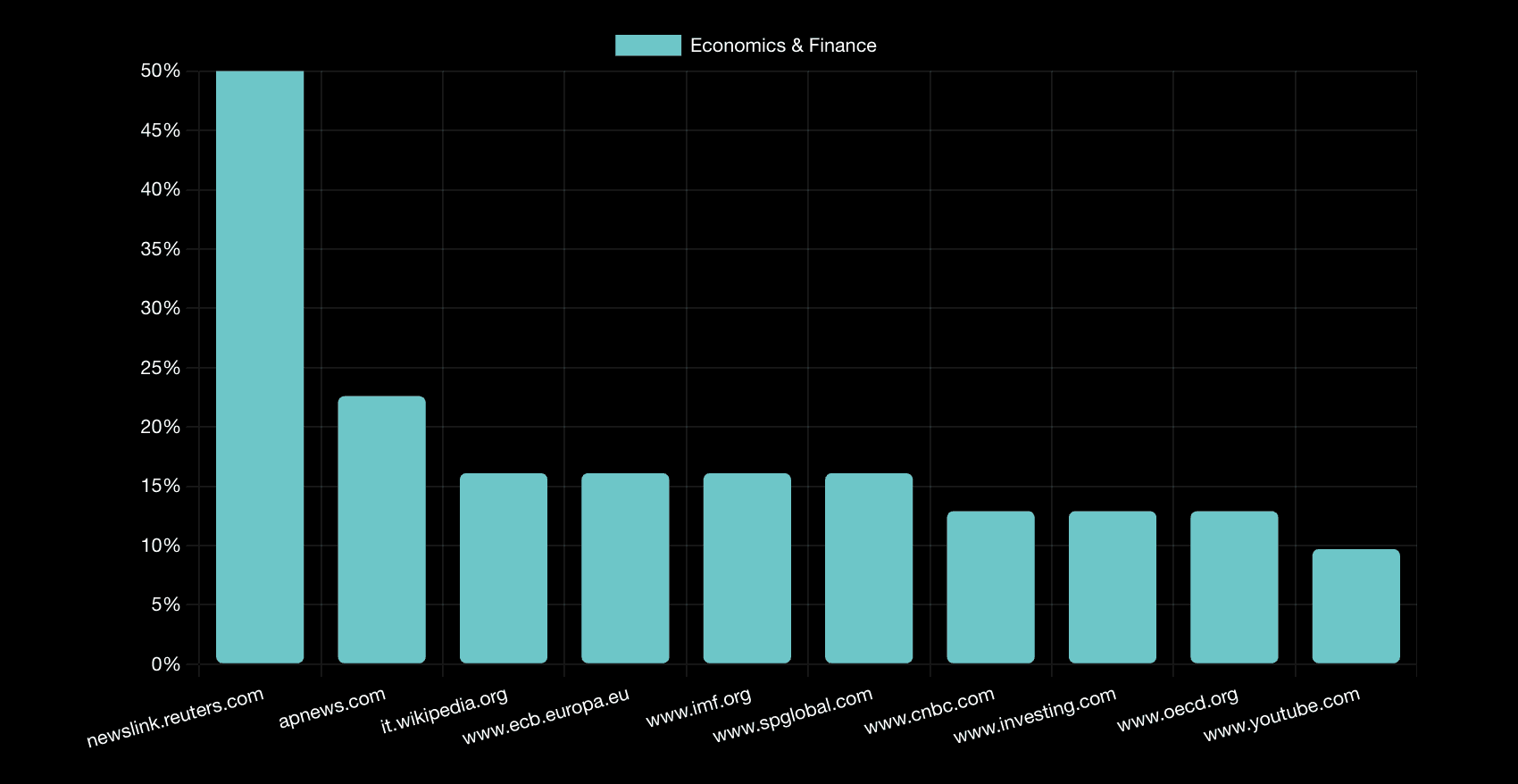 Economics shows institutional authority, with ECB, IMF, S&P Global, and OECD each capturing 12.9-16.1% alongside commercial financial media.