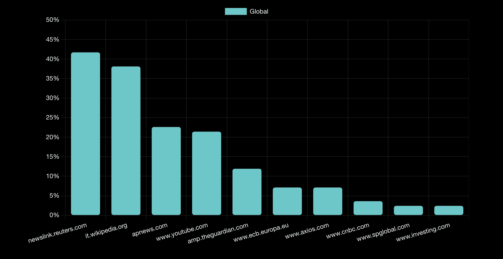CNBC appears at 12.9%, Investing.com at 12.9%, and OECD at 12.9%, indicating distributed citation patterns among specialized financial sources.