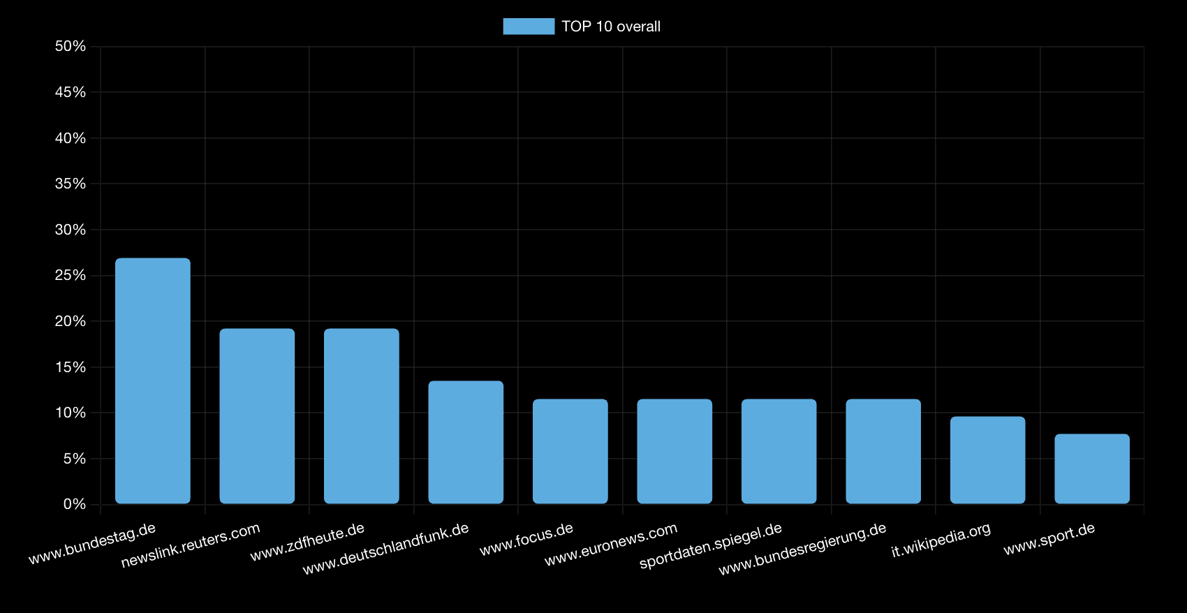 The official Bundestag website maintains 26.9% (↑ from 25.5%), showing consistent government source authority across platforms with modest growth.