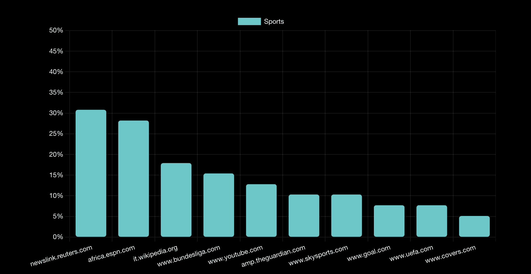 Reuters maintains 30.8% (↑ from 29.7%), demonstrating wire service relevance for sports news alongside specialized sports media.