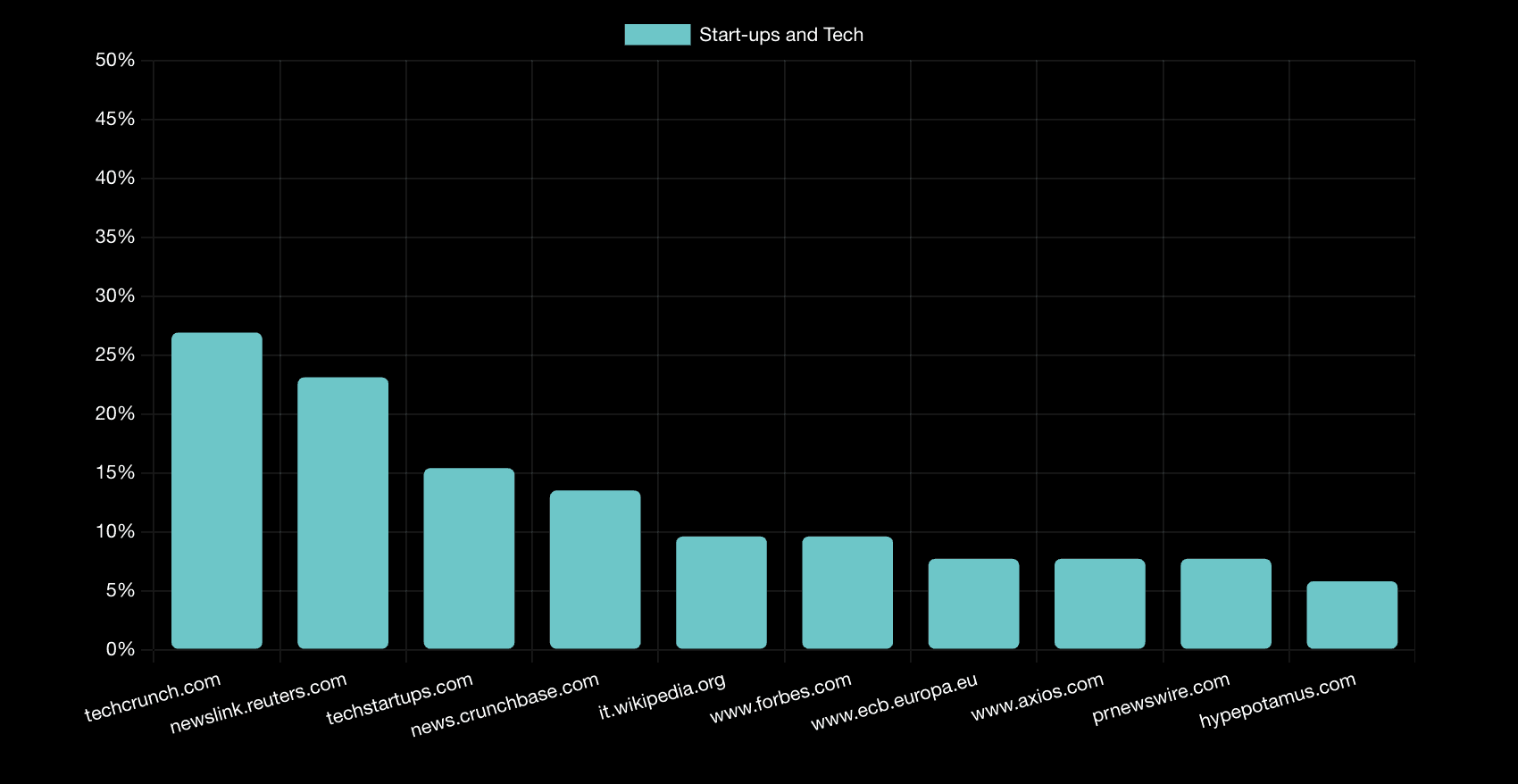 PR Newswire appears at 7.7%, reflecting the role of press releases in startup coverage, while Hypepotamus captures 5.8% as a regional technology source.
